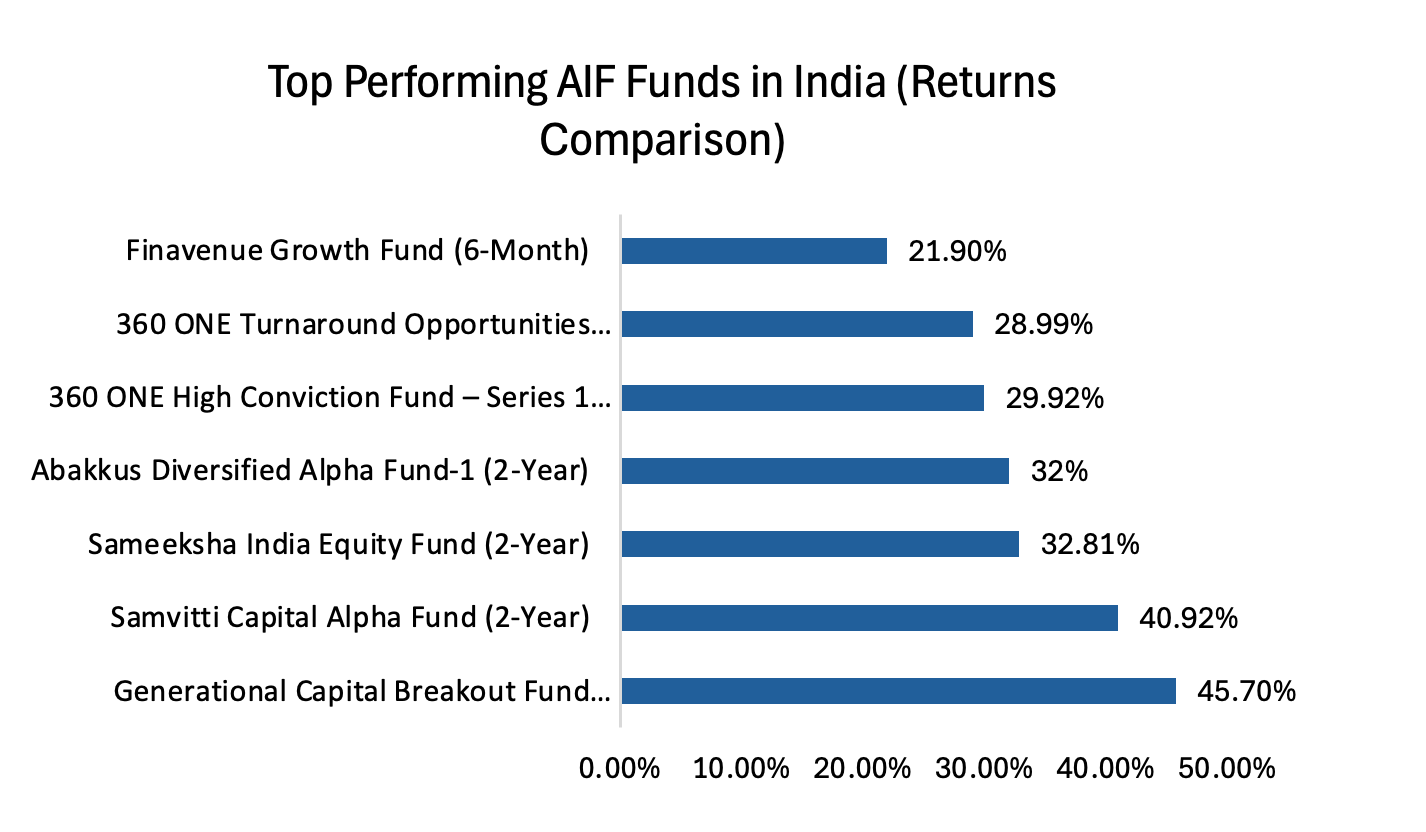 Using this data, we can compare the performance of different AIF funds. From the data, we can see that the 360 ONE High Conviction Fund – Series 1 has achieved 29.92% returns over two years and 28.75% over three years due to its focus on high-growth companies.