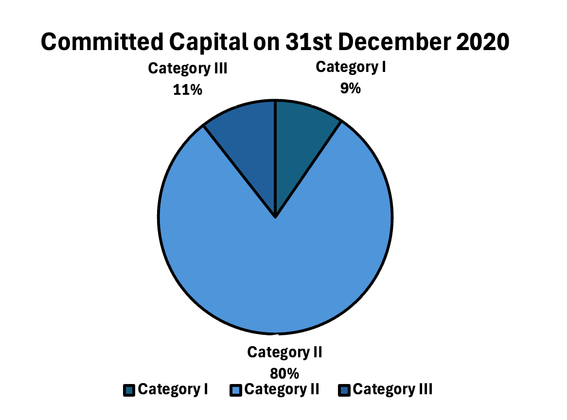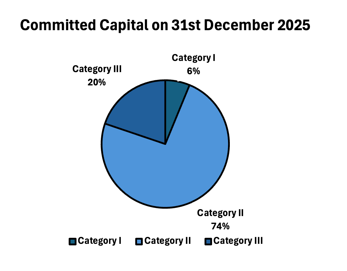 Category II accounts for more than half of deployed capital. Category III represents nearly 20%, reflecting tactical hedge-style demand. Category I remains under 10%, concentrated in venture and SME capital formation.